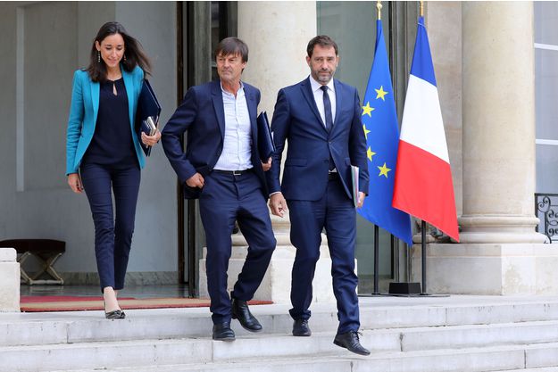 Photo : Brune Poirson secrétaire d’Etat, Nicolas Hulot Ministre d’Etat et Christophe Castaner porte parole du gouvernement à la sortie du conseil des ministres, mercredi à l’Elysée.