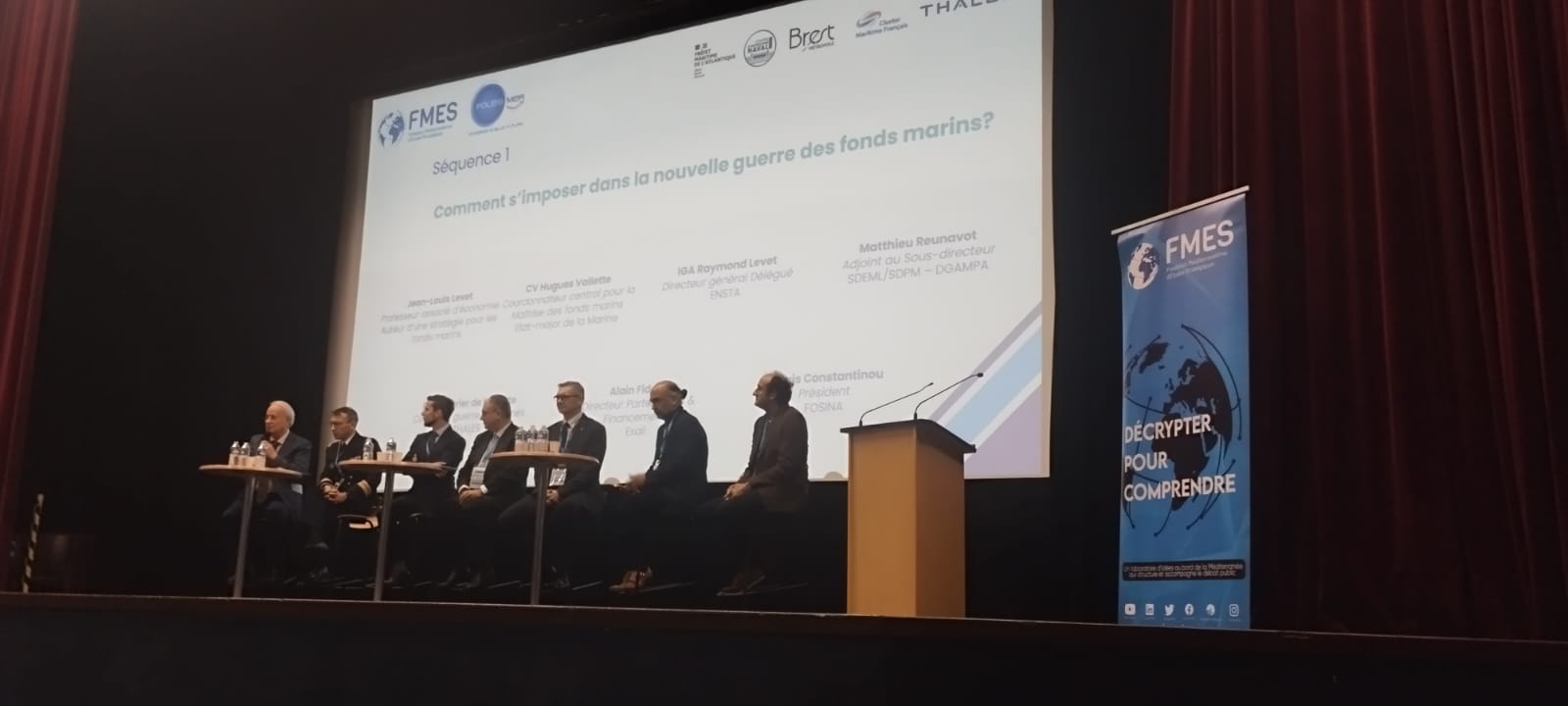 Les intervenants : Jean-Louis Levet, Professeur associé d’économie, CV Hugues Vallette, Coordonnateur central pour la maîtrise des fonds marins à l’État- Major de la Marine nationale, IGA Raymond Levet, Directeur général délégué de l’ENSTA, Matthieu Reunavot, Direction générale des affaires maritimes, de la pêche et de l’aquaculture de la DGAMPA, Benoit Drier de Laforte, Conseiller opérationnel en guerre des mines de Thales, Alain Fidani, Directeur Partenariats et Financement de l’Innovation d’Exail, Alexis Constantinou, Président de FOSINA, modérateur Francis Vallat. Photo @FMES