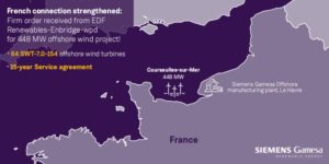 D’une capacité de 448 MW, le projet du parc éolien en mer du Calvados est composé de 64 éoliennes Siemens-Gamesa de 7MW SWT-7.0-154 et contrat de service de maintenance de 15 ans.