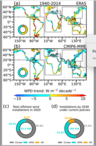 Un réchauffement de 4°C pourrait augmenter le potentiel de l’énergie éolienne offshore de 9 % en moyenne d’ici la fin du siècle et pourrait ouvrir la voie à un potentiel accru pour l’énergie éolienne offshore. Les chercheurs ont notamment travaillé à partir de données de Wpd Offshore.