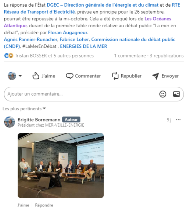 Comme l’avait annoncé energiesdelamer.eu , la réponse à l’appel d’offres qui devait être remise par l’Etat et RTE à la commission nationale de débat public n’a pas pu se tenir. En remplacement, et dans cette attente, une rencontre entre la commission nationale de débat public, Ilaria Casillo, Florent Augnagneur, vice-président et président de la commission particulière du débat « La mer en débat », Francis Beaucire, Caroline Werkoff, et les deux ministres, Olga Givernet et Fabrice Loher s’est tenue en l’absence d’Agnès Pannier-Runacher. Le 26 septembre, date limite de la remise de la réponse a donc été en partie respectée, mais avec une demande de report à une date ultérieure afin que les ministères puissent prendre la dimension du dossier. Le discours de politique générale qui doit être prononcé à 15h aujourd’hui par le Premier ministre, devrait nous indiquer quelques pistes.