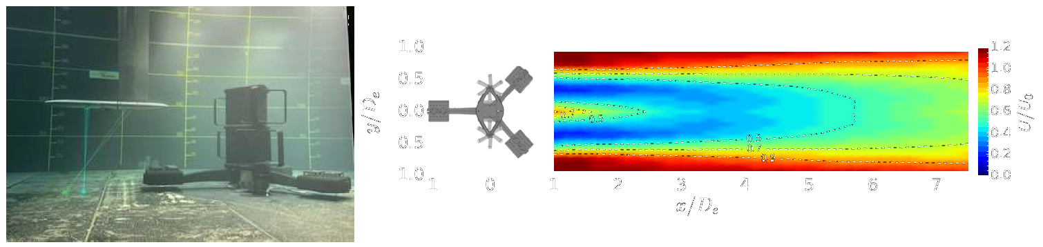 Illustration des mesures LDV 3C en amont de l’hydrolienne à droite et sillage en écoulement stationnaire à gauche