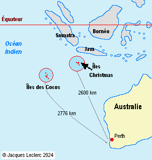 On ne sait trop par qui cette île de l’océan Indien, aux formes étranges, fut découverte. Il semble que l’île ait été notée sur une carte hollandaise par Pieter Goos, publiée en 1666 et désignée sous le nom de Moni. Pourtant, le capitaine William Mynors avait donné à l’île son nom actuel (Christmas), car il y était arrivé le jour de Noël, le 25 décembre 1643, sans pouvoir y débarquer. C’est en 1688 que le premier Européen, le corsaire anglais William Dampier, avec deux hommes de son équipage, aborda l’île. La première installation n’a eu lieu que deux cents ans plus tard, en 1888, au lieu-dit Flying Fish Cove, par George Clunies-Ross qui, avec sir John Murray, un naturaliste britannique, obtint la première location de terres. Ayant analysé des échantillons de roche, Murray avait constaté qu’elle était composée presque uniquement de phosphate. L’exploitation du phosphate débuta en 1897 avec la fondation de la Christmas Island Phosphate Co. Ltd. Comme il n’y avait aucune population indigène, la compagnie dut importer de la main-d’oeuvre. Dès 1898, on embaucha 200 travailleurs chinois, huit Européens comme personnel de gestion et cinq policiers sikhs. Puis la Grande-Bretagne annexa l’île au Royaume-Uni. Par la suite, la Christmas Island Phosphate Co. Ltd. importa des travailleurs malais. À partir de mars 1942 jusqu’à à la fin de la Seconde Guerre mondiale en 1945, les forces japonaises occupèrent l’île; la plupart des femmes et des enfants furent évacués. En 1946, l’île Christmas fut placée sous la juridiction de la colonie britannique de Singapour. En 1948, les gouvernements australien et néo-zélandais qui, avec les British Phosphate Commissioners, avaient poursuivi l’exploitation intensive des mines rachetèrent l’île à la Christmas Island Phosphate Company. |