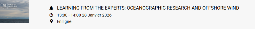 Le cycle de conférences « Apprendre des experts » est une série de webinaires éducatifs animée par l’équipe Éolien en mer de la NYSERDA. Des experts indépendants y interviennent sur des sujets clés liés à l’éolien en mer, tels que les technologies des parcs éoliens, les pratiques de développement, les processus réglementaires et les initiatives de recherche.