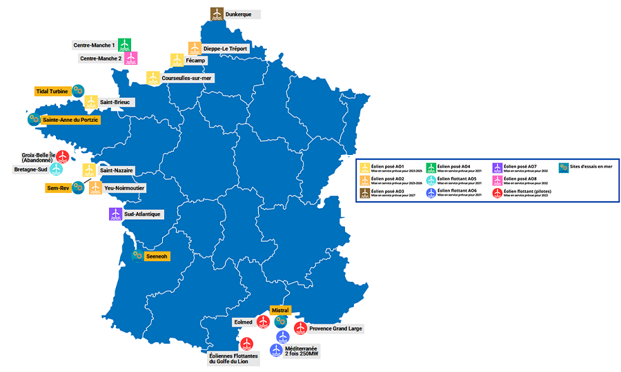 AO 06 (historique) : MéditerranéeNom : Projet de parc éolien en mer flottant de Méditerranée (AO6 attribué le 27 décembre 2024) Consortium : Les deux lauréats sont : "Éoliennes Flottantes d'Occitanie - EFLO" d'Ocean Winds (Engie et EDPR) et de la Banque des territoires (Eolien en Mer Participation) "Méditerranée ... |